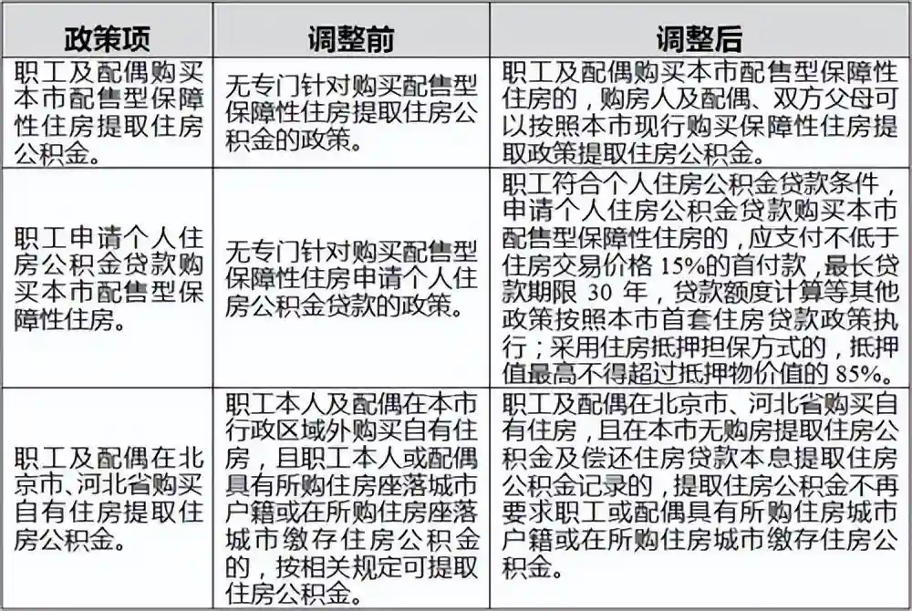 通过调整住房公积金提取、贷款政策,加大对缴存职工解决基本住房问题的支持力度,支持购买配售型保障性住房,进一步推动京津冀住房公积金协同发展走深走实。