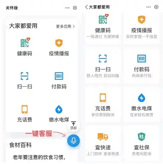 例如支付宝的“关怀版”小程序没有仅仅局限在将字体放大,而是重新设计版式,将老年人常用的功能图标及文字放大显示,方便老年人使用。