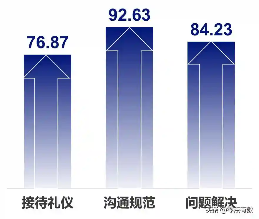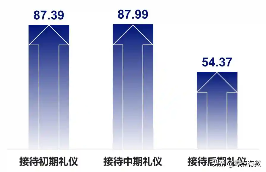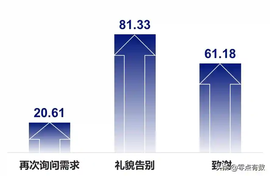 接待后期礼仪的三个指标中,再次询问需求和致谢指标得分分别为20.61分和61.18分,相关服务细节尚有较大改善空间。