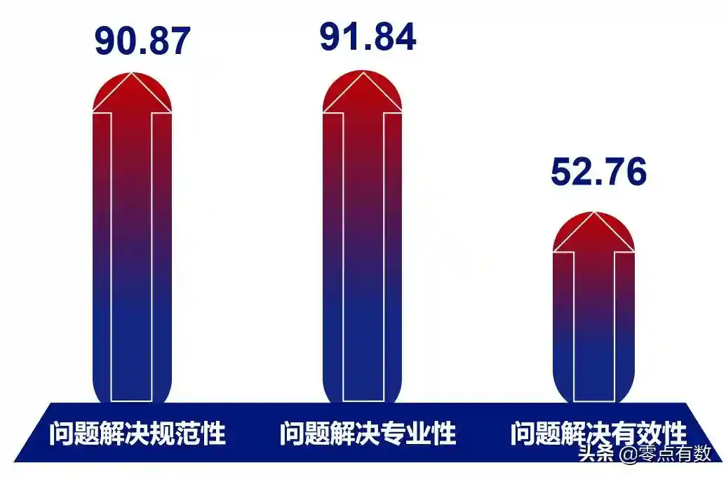 问题解决的三个指标中,问题解决规范性和问题解决专业性指标表现较好,相关工作人员基本能够规范、专业地解决相关问题;问题解决有效性指标得分为52.76分,解决效果尚不理想,亟需提升。