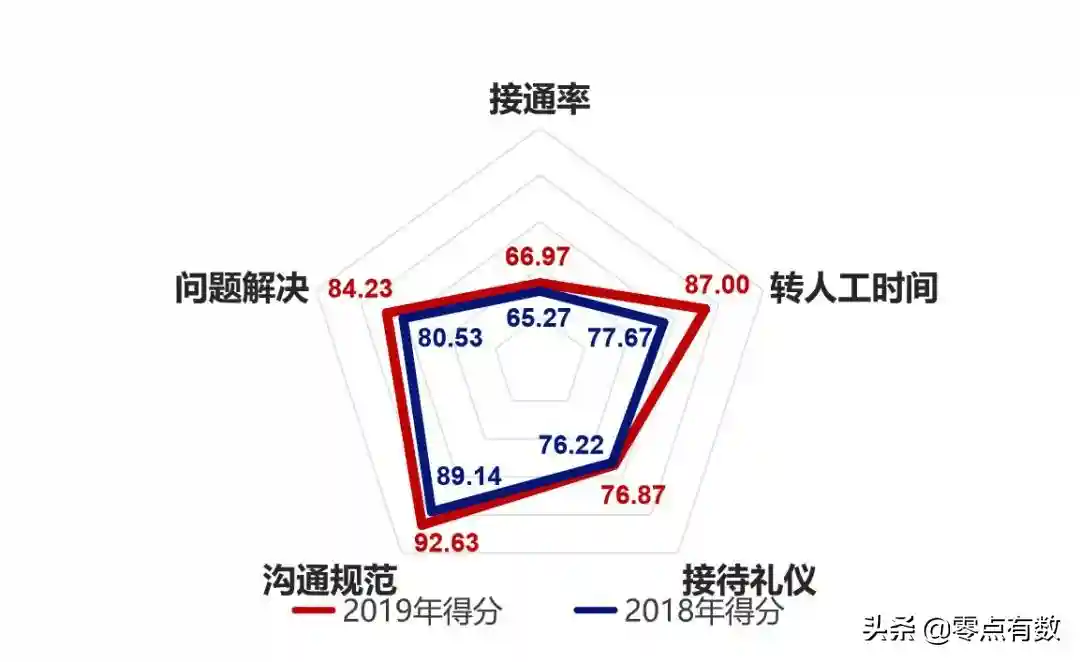各一级指标中,沟通规范表现最好(92.63分),接通率得分最低(66.97分)。与2018年相比,本年度各一级指标均有所提升,其中转人工时间提升最多。