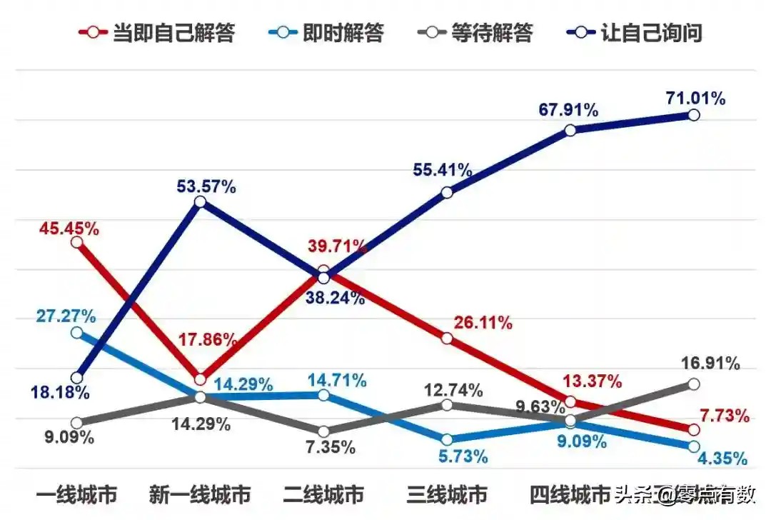 从不同级别城市看,一线城市中,45.45%的政务热线电话接线员能够当即自己解答问题;二线及以下城市接线员“当即自己解答率”随着城市级别降低而降低,在三线、四线、五线城市中,政务热线单位的问题解答方式更多的是让服务对象自己询问。