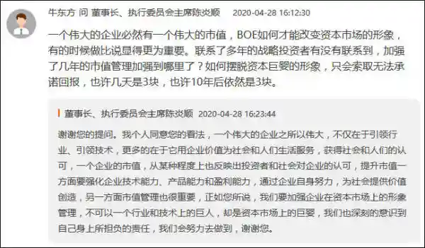“一个伟大的企业必然有一个伟大的市值,BOE如何才能改变资本市场的形象,有的时候做比说显得更为重要。”在业绩说明会上,有投资者向其董事长陈炎顺质疑:“(京东方)如何摆脱资本巨婴的形象?”