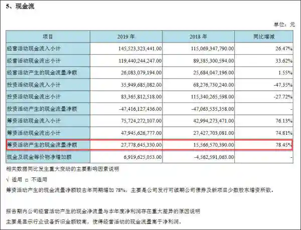 当年,其投资活动产生的现金流量净额为-474.2亿元,筹资活动产生的现金流量净额为277.8亿元,同比增长78%,财报中称是主要是发行可续期公司债券及新项目少数股东增资所致。