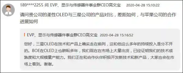 在谈到京东方柔性OLED与三星的差距时,高文宝表示:“三星OLED在技术和产品上确实走在前列,这和他这么多年的持续投入是分不开的。京东方在OLED上也耕耘多年,我们现在在市场上大量出货,已经证明我们的技术成熟度和大规模量产能力。”
