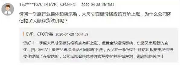 该公司CFO孙芸指出,一季度大尺寸面板价格有所上涨,但受疫情影响,供需又出现新变化,四月份TV主要产品再次出现不同幅度下跌,因此在一季报进行评估时根据市场价格变化提取了存货跌价。