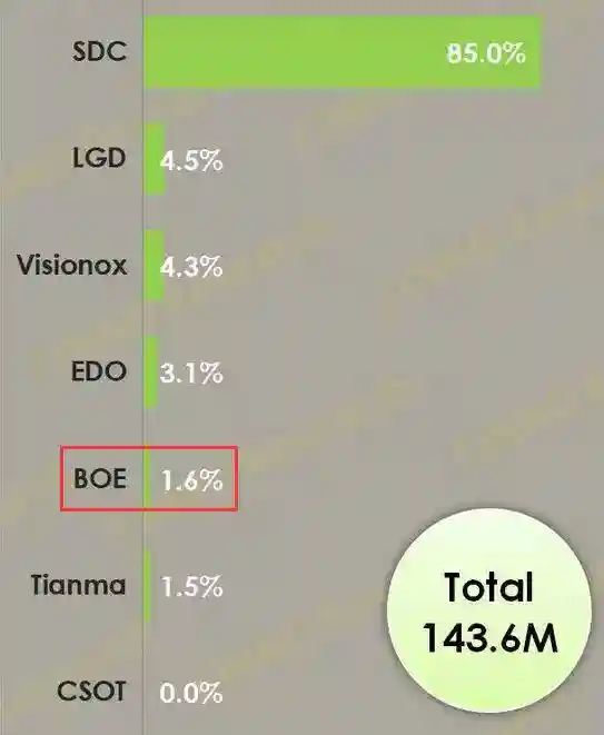 根据上述机构的报告,三星去年第四季度AMOLED智能机面板出货约1.2亿片,市场份额85.0%,占据第一。LGD、维信诺、和辉光电、京东方分别出货650万片、610万片、440万片、230万片。