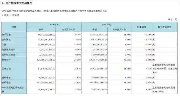 其中,货币资金为569.7亿元,占总资产比例为16.74%;应收账款为181.4亿元,占比为5.33%;存货为124亿元,占比为3.64%;固定资产为1257.9亿元,占比最高,为36.95%,同比下降5.2个百分点;在建工程为873.8亿元,占比为25.67%,同比上升7.11个百分点;投资性房地产为12.4亿元,占比为0.36%。