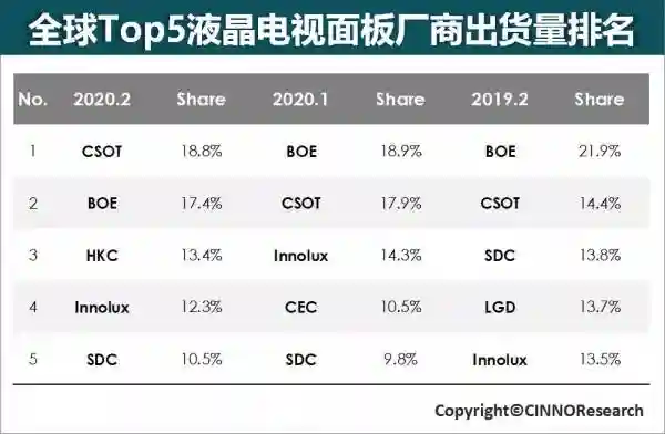 雪上加霜的是,今年2月,京东方“全球第一大液晶电视面板供应商”的头衔首次被华星光电夺走,后者以18.8%的份额超越京东方的17.4%,而惠科、群创光电、三星显示分列4-5名。