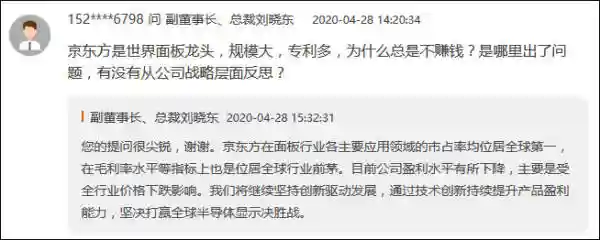 对此,京东方总裁刘晓东回应称:这个提问很尖锐,京东方在面板行业各主要应用领域的市占率均位居全球第一,在毛利率水平等指标上也位居全球行业前茅,盈利水平下降主要受行业价格下跌影响。