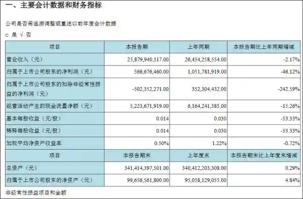 一季度财报显示,京东方实现营业收入258.80亿元,同比下降2.17%;归属于上市公司股东的净利润5.67亿元,同比下降46.12%;扣除非经常性损益的净利润-5.02亿元,同比下降242.59%。