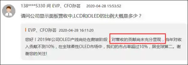 在2025年业绩说明会上,京东方CFO孙芸介绍称,该公司在全球柔性OLED市场中市占率超过10%,居全球第二。不过产线尚处在爬坡阶段,对营收的贡献尚未充分显现,当年对收入贡献不到10%。