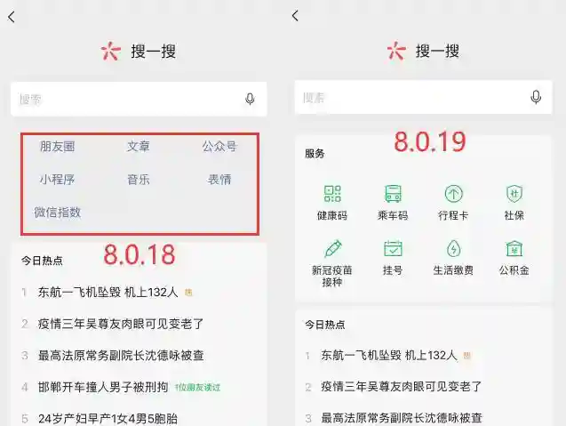 搜一搜页面搜索框下方的分类更新为服务版块,可快速打开健康码、乘车码、行程卡、社保、新冠疫苗接种、挂号、生活缴费和公积金等服务页面,取消了朋友圈、文章、公众号、小程序、音乐、表情和微信指数版块。